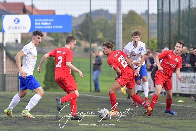 Fussball, Rheinlandliga, SG Malberg (rot) vs. VfB Wissen (weiss/blau), 29.10.2022 | ||