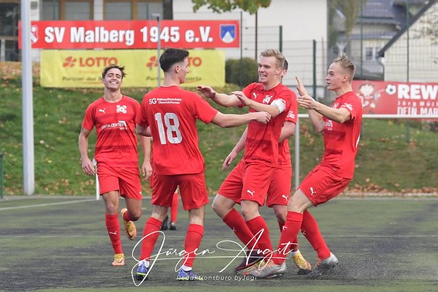 Fussball, Rheinlandliga, SG Malberg (rot) vs. VfB Wissen (weiss/blau), 29.10.2022 | ||