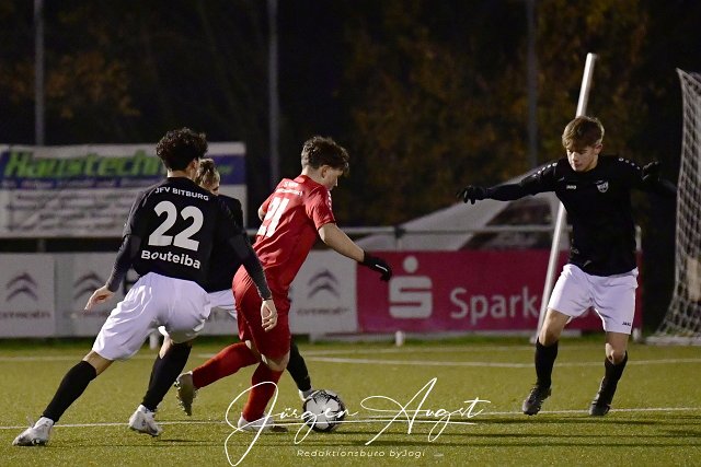 Fussball, Rheinlandliga B-Junioren, JSG Neitersen (rot) vs. JFV Bitburg (schwarz/weiss), 03.12.2022 | ||