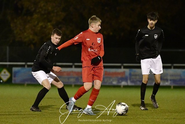 Fussball, Rheinlandliga B-Junioren, JSG Neitersen (rot) vs. JFV Bitburg (schwarz/weiss), 03.12.2022 | ||
