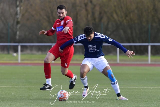 Fussball, Bezirksliga Fussball- BezirksligaOst, SG Berod-Wahlrod-Lautzert-Oberdreis (rot) vs. SG Westerburg-Gemuenden-Willmenrod (blau/weiss), 26.02.2023 | ||