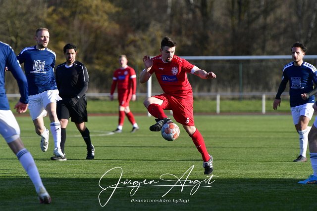 Fussball, Bezirksliga Fussball- BezirksligaOst, SG Berod-Wahlrod-Lautzert-Oberdreis (rot) vs. SG Westerburg-Gemuenden-Willmenrod (blau/weiss), 26.02.2023 | ||