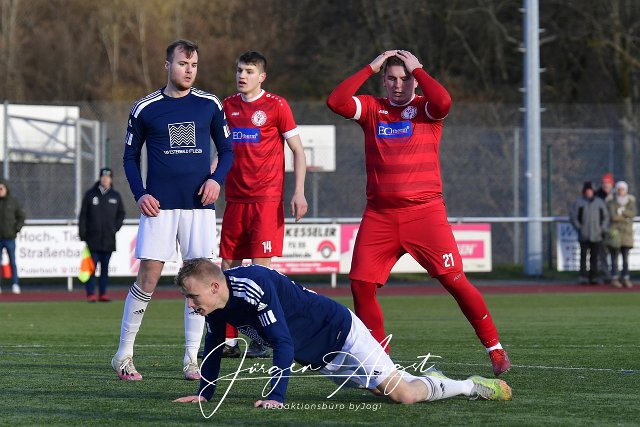 Fussball, Bezirksliga Fussball- BezirksligaOst, SG Berod-Wahlrod-Lautzert-Oberdreis (rot) vs. SG Westerburg-Gemuenden-Willmenrod (blau/weiss), 26.02.2023 | ||