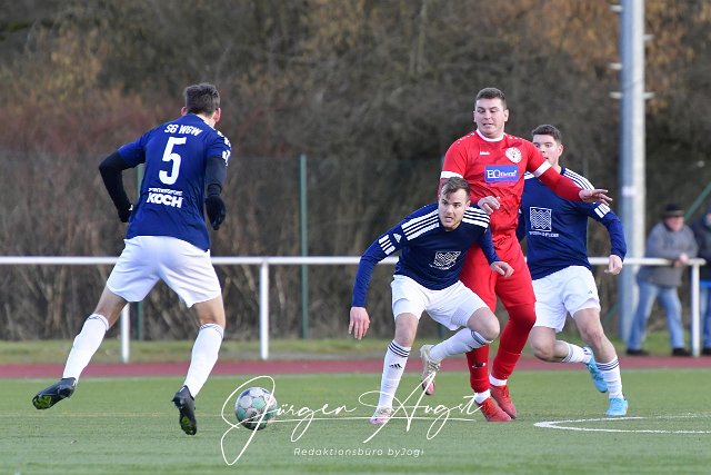 Fussball, Bezirksliga Fussball- BezirksligaOst, SG Berod-Wahlrod-Lautzert-Oberdreis (rot) vs. SG Westerburg-Gemuenden-Willmenrod (blau/weiss), 26.02.2023 | ||
