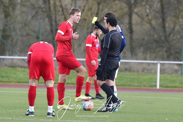 Fussball, Bezirksliga Fussball- BezirksligaOst, SG Berod-Wahlrod-Lautzert-Oberdreis (rot) vs. SG Westerburg-Gemuenden-Willmenrod (blau/weiss), 26.02.2023 | ||