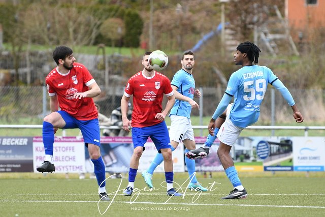 Fussball, Rheinlandliga, SG Altenkirchen-Neitersen (rot/blau) vs. FC Cosmos Koblenz (Hellblau/weiss), 12.03.2023 | ||
