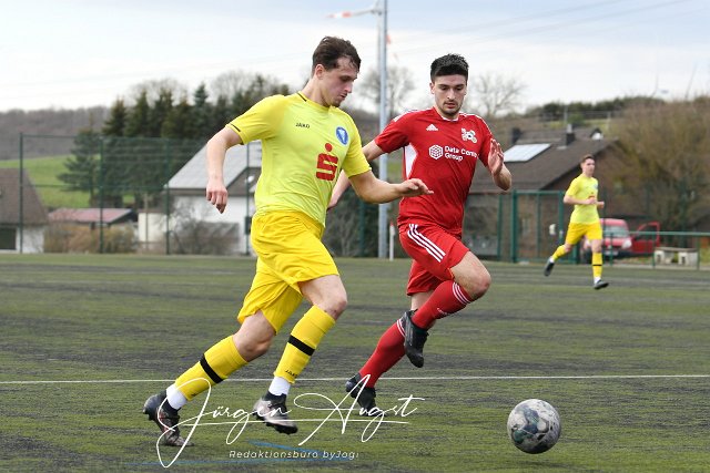 Fussball, Rheinlandliga, SG Malberg (rot) vs FC Metternich (neon-gelb), 18.03.2023 | ||