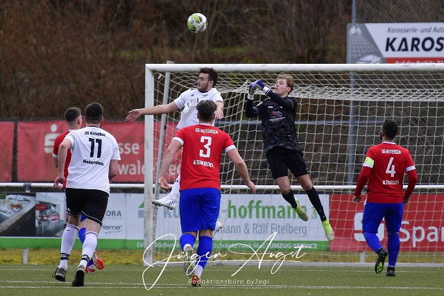 Fusball, Kreisliga B2, SG Altenkirchen-Neitersen II (rot/blau) vs. SG Mittelhof-Niederhoevels (weiss/schwarz), 19.03.2023 | ||