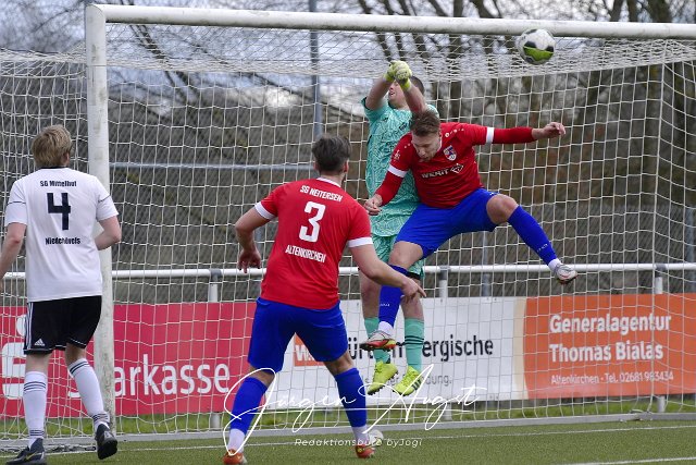 Fusball, Kreisliga B2, SG Altenkirchen-Neitersen II (rot/blau) vs. SG Mittelhof-Niederhoevels (weiss/schwarz), 19.03.2023 | ||