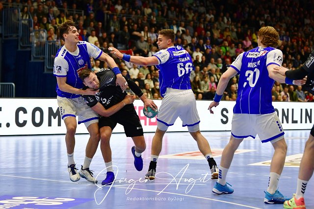 Julian Koester (VfL Gummersbach / #7) und Stepan Zeman (VfL Gummersbach / #66) stoppen Sander Sagosen (THW Kiel / #5) Handball, 1 Bundesliga, VfL Gummersbach vs. THW Kiel, 25. Spieltag, Schwalbe Arena Gummersbach, 02.04.2023 Foto: Eibner-Pressefoto/Juergen Augst | ||