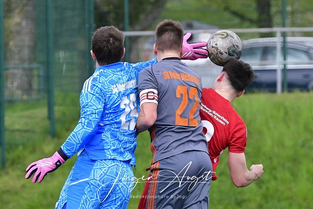 Fussball, Rheinlandliga, SG Malberg (rot) vs. SG HWW Niederrossbach (grau), 22.04.2023 | ||
