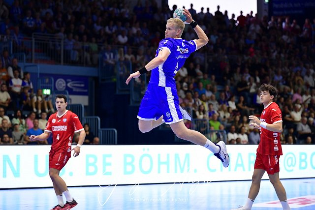 Ellidi Vidarsson (VfL Gummersbach / #4) mit gewaltigem Sprungwurf, Handball, 1 Bundesliga, VfL Gummersbach vs. TBV Lemgo Lippe, 1. Spieltag, Schwalbe Arena Gummersbach, 27,08.2023 Foto: Eibner-Pressefoto/Juergen Augst | ||