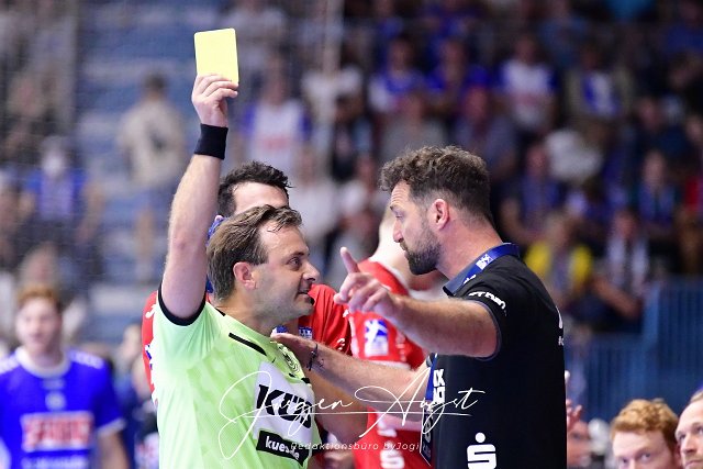 Gelbe Karte fuer Florian Kehrmann (Trainer TBV Lemgo Lippe) Handball, 1 Bundesliga, VfL Gummersbach vs. TBV Lemgo Lippe, 1. Spieltag, Schwalbe Arena Gummersbach, 27,08.2023 Foto: Eibner-Pressefoto/Juergen Augst | ||