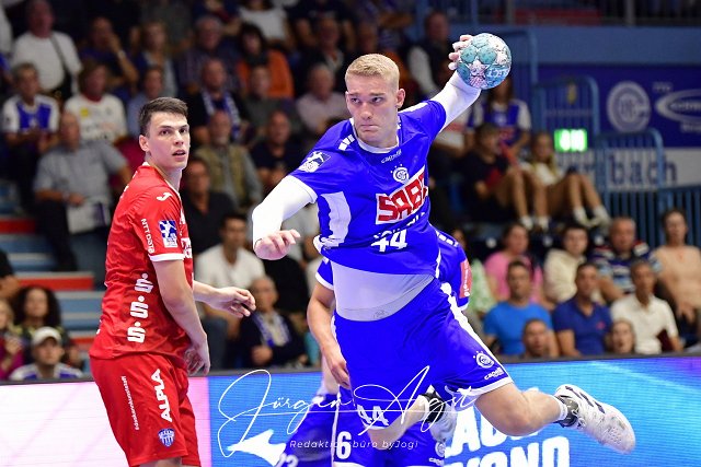 Tom Jansen (VfL Gummersbach / #44) ist an Frederik Simak (TBV Lemgo Lippe / #8) vorbei, Handball, 1 Bundesliga, VfL Gummersbach vs. TBV Lemgo Lippe, 1. Spieltag, Schwalbe Arena Gummersbach, 27,08.2023 Foto: Eibner-Pressefoto/Juergen Augst | ||
