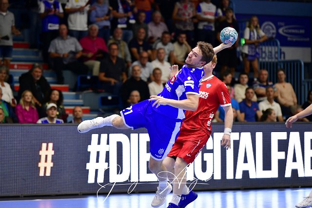 Dominik Mappes (VfL Gummersbach / #21) Handball, 1 Bundesliga, VfL Gummersbach vs. TBV Lemgo Lippe, 1. Spieltag, Schwalbe Arena Gummersbach, 27,08.2023 Foto: Eibner-Pressefoto/Juergen Augst | ||