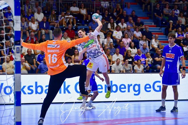 Marius Steinhauser (TSV Hannover-Burgdorf / #19) gegen Tibor Ivanisevic (VfL Gummersbach / #16) Handball, 1 Bundesliga, 3. Spieltag, VfL Gummersbach vs. TSV Hannover-Burgdorf, Schwalbe Arena Gummersbach, 08.09.2023 Foto: Eibner-Pressefoto/Juergen Augst | ||