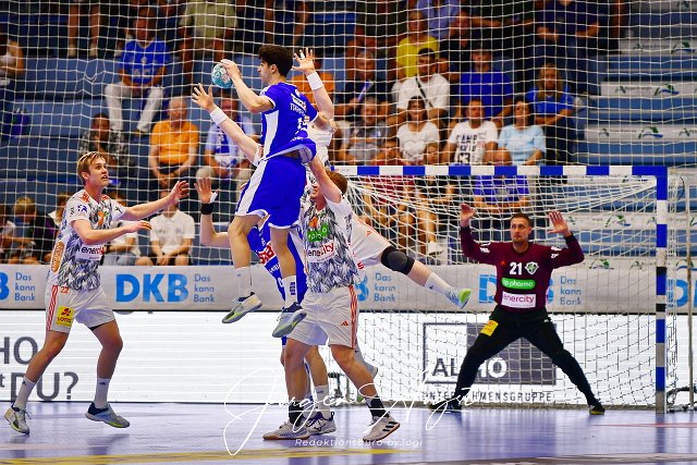 Giorgi Tskhovrebadze (VfL Gummersbach / #19) im Angriff gegen Branko Vujovic (TSV Hannover-Burgdorf / #2) Handball, 1 Bundesliga, 3. Spieltag, VfL Gummersbach vs. TSV Hannover-Burgdorf, Schwalbe Arena Gummersbach, 08.09.2023 Foto: Eibner-Pressefoto/Juergen Augst | ||