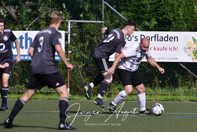 Fussball, Kreisliga B1, SV Adler Derschen (weiß/schwarz) vs. SV Niederfischbach II (grau/schwarz), 17.09.2023 | ||
