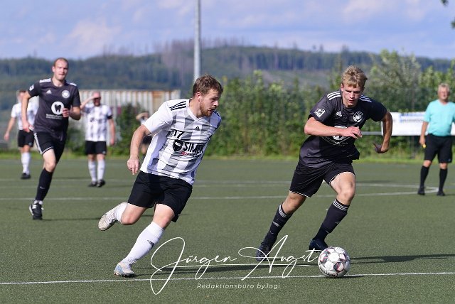 Fussball, Kreisliga B1, SV Adler Derschen (weiß/schwarz) vs. SV Niederfischbach II (grau/schwarz), 17.09.2023 | ||