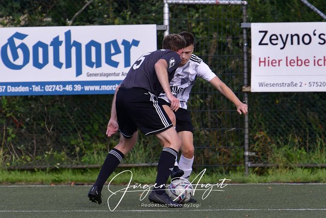 Fussball, Kreisliga B1, SV Adler Derschen (weiß/schwarz) vs. SV Niederfischbach II (grau/schwarz), 17.09.2023 | ||