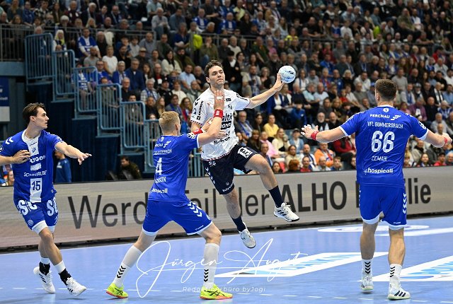 Niclas Kirkeloekke (SG Flensburg-Handewitt 5) gegen hEllidi Vidarsson (VfL Gummersbach 4) VfL Gummersbach vs. SG Flensburg Handewitt, Handball, Daikin 1. Bundesliga, 5. Spieltag, Spielzeit 2024-2025, Schwalbe Arena Gummersbach, 06.10.2024 Foto: Eibner-Pressefoto/Juergen Augst | ||