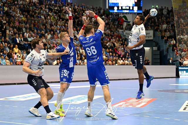 Mads Mensah Larsen (SG Flensburg-Handewitt 22) gegen Stepan Zeman (VfL Gummersbach 66) und Ellidi Vidarsson (VfL Gummersbach 4) VfL Gummersbach vs. SG Flensburg Handewitt, Handball, Daikin 1. Bundesliga, 5. Spieltag, Spielzeit 2024-2025, Schwalbe Arena Gummersbach, 06.10.2024 Foto: Eibner-Pressefoto/Juergen Augst | ||