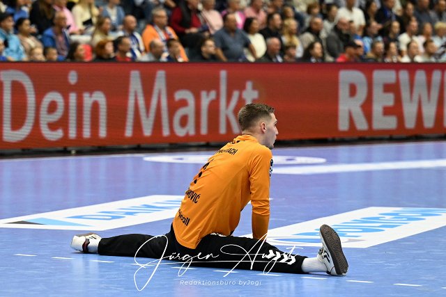 Spagat von Dominik Kuzmanovic (VfL Gummersbach 1) VfL Gummersbach vs. SG Flensburg Handewitt, Handball, Daikin 1. Bundesliga, 5. Spieltag, Spielzeit 2024-2025, Schwalbe Arena Gummersbach, 06.10.2024 Foto: Eibner-Pressefoto/Juergen Augst | ||