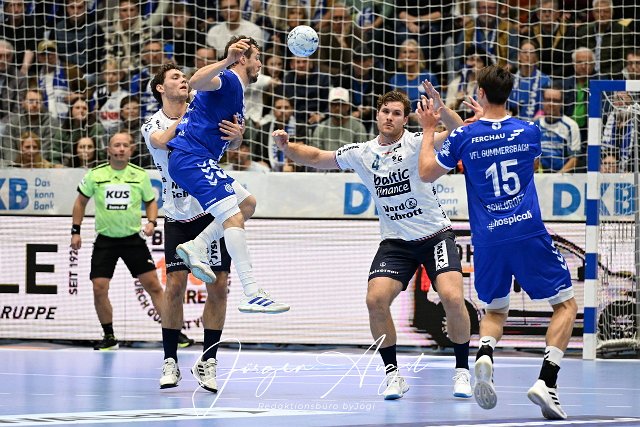 Kentin Mahe (VfL Gumersbach 22) und Miro Schluroff (VfL Gummersbach 15) gegen Johannes Golla (SG Flensburg-Handewitt 4) und Niclas Kirkeloekke (SG Flensburg-Handewitt 5) VfL Gummersbach vs. SG Flensburg Handewitt, Handball, Daikin 1. Bundesliga, 5. Spieltag, Spielzeit 2024-2025, Schwalbe Arena Gummersbach, 06.10.2024 Foto: Eibner-Pressefoto/Juergen Augst | ||