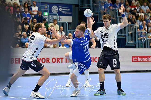 Kristjan Horzen (VfL Gummersbach 27 ) gegen Simon Pytlick (SG Flensburg-Handewitt 2) und Lukas Jorgensen (SG Flensburg-Handewitt 25) VfL Gummersbach vs. SG Flensburg Handewitt, Handball, Daikin 1. Bundesliga, 5. Spieltag, Spielzeit 2024-2025, Schwalbe Arena Gummersbach, 06.10.2024 Foto: Eibner-Pressefoto/Juergen Augst | ||