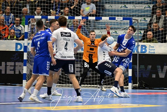 #2 Simon Pytlick (SG Flensburg-Handewitt 2) gegen Dominik Kuzmanovic (VfL Gummersbach 1) und Miro Schluroff (VfL Gummersbach 15) VfL Gummersbach vs. SG Flensburg Handewitt, Handball, Daikin 1. Bundesliga, 5. Spieltag, Spielzeit 2024-2025, Schwalbe Arena Gummersbach, 06.10.2024 Foto: Eibner-Pressefoto/Juergen Augst | ||
