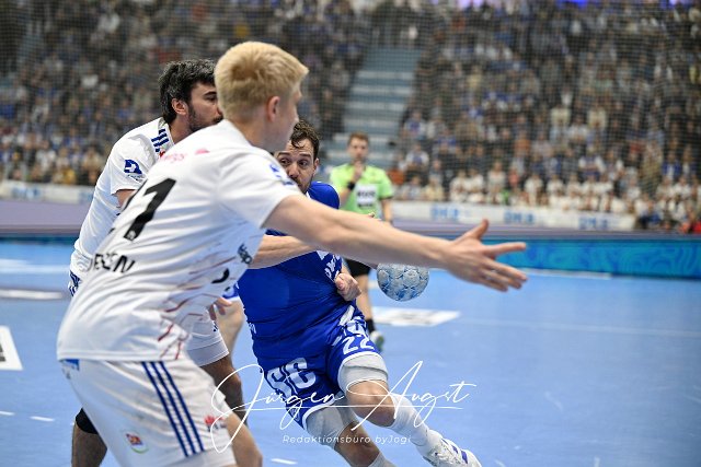 Kentin Mahe (VfL Gumersbach 22) gegen Frederik Bo Andersen (Handball Sportverein Hamburg 21) und Moritz Sauter (Handball Sportverein Hamburg 33) VfL Gummersbach vs. Handball Sportverein Handball, Daikin 1. Bundesliga, 9. Spieltag, Spielzeit 2024-2025, Schwalbe Arena Gummersbach, 03.11..2024 Foto: Eibner-Pressefoto/Juergen Augst | ||
