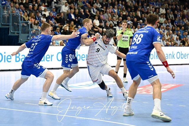 Jacob Arenth Lassen (Handball Sportverein Hamburg 9) gegen Tilen Kodrin (VfL Gummersbach 5) und Kristjan Horzen (VfL Gummersbach 27 ) VfL Gummersbach vs. Handball Sport Verein Hamburg, Daikin 1. Bundesliga, 9. Spieltag, Spielzeit 2024-2025, Schwalbe Arena Gummersbach, 03.11.2024 Foto: Eibner-Pressefoto/Juergen Augst | ||