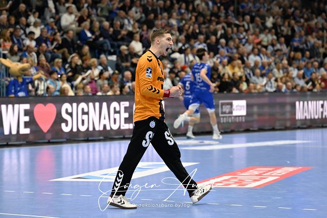 Dominik Kuzmanovic (VfL Gummersbach 1) jubelt VfL Gummersbach vs. Handball Sport Verein Hamburg, Daikin 1. Bundesliga, 9. Spieltag, Spielzeit 2024-2025, Schwalbe Arena Gummersbach, 03.11.2024 Foto: Eibner-Pressefoto/Juergen Augst | ||