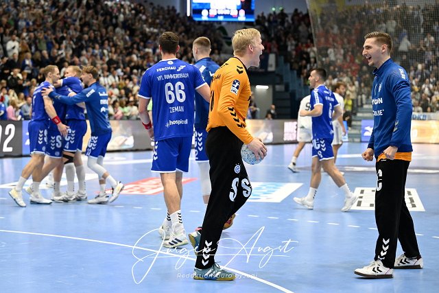 Bertram Obling (VfL Gummersbach 16) und Dominik Kuzmanovic (VfL Gummersbach 1) bejubel mit ihren Mannschaftskamerden den Heimsieg ueber den HSV Hamburg VfL Gummersbach vs. Handball Sport Verein Hamburg, Daikin 1. Bundesliga, 9. Spieltag, Spielzeit 2024-2025, Schwalbe Arena Gummersbach, 03.11.2024 Foto: Eibner-Pressefoto/Juergen Augst | ||