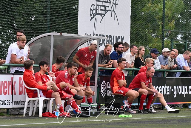 Fussball, Bezirksliga Ost, SG Malberg (rot) vs. SG Westerburg-Gemuenden-Willmenrod (schwarz-weiß) , 16.08.2025 | ||