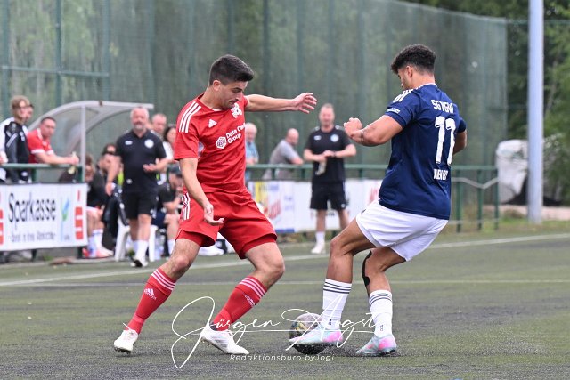 Fussball, Bezirksliga Ost, SG Malberg (rot) vs. SG Westerburg-Gemuenden-Willmenrod (schwarz-weiß) , 16.08.2025 | ||