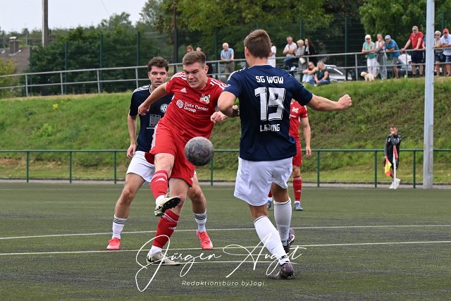 Fussball, Bezirksliga Ost, SG Malberg (rot) vs. SG Westerburg-Gemuenden-Willmenrod (schwarz-weiß) , 16.08.2025 | ||