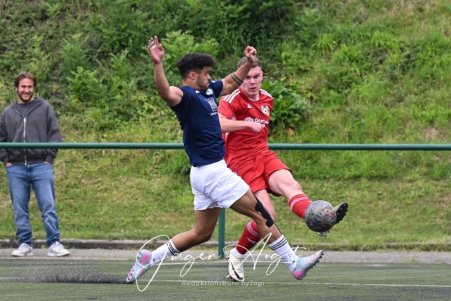 Fussball, Bezirksliga Ost, SG Malberg (rot) vs. SG Westerburg-Gemuenden-Willmenrod (schwarz-weiß) , 16.08.2025 | ||