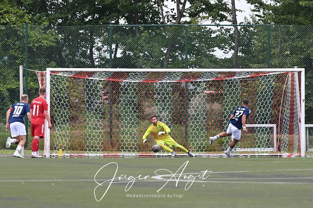 Fussball, Bezirksliga Ost, SG Malberg (rot) vs. SG Westerburg-Gemuenden-Willmenrod (schwarz-weiß) , 16.08.2025 | ||
