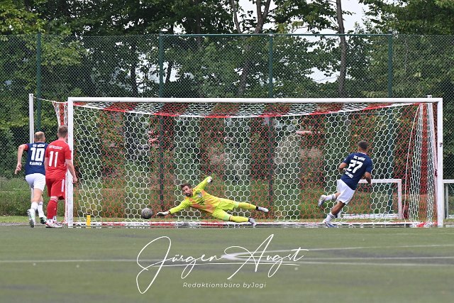 Fussball, Bezirksliga Ost, SG Malberg (rot) vs. SG Westerburg-Gemuenden-Willmenrod (schwarz-weiß) , 16.08.2025 | ||