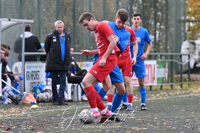 Fussball, Bezirksliga Ost, SG Malberg (rot) vs. SG Mueschenbach (blau), 02.11.2025 | ||