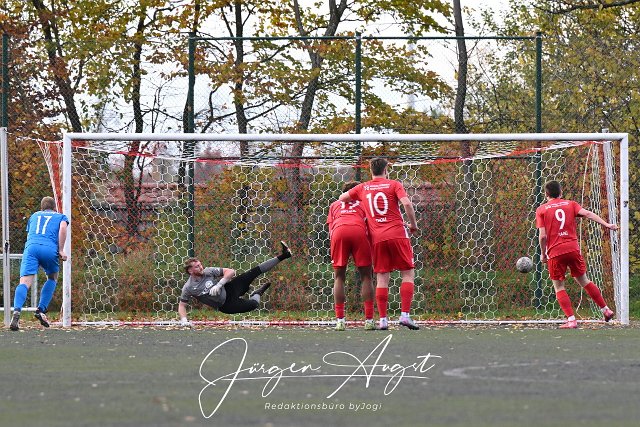 Fussball, Bezirksliga Ost, SG Malberg (rot) vs. SG Mueschenbach (blau), 02.11.2025 | ||
