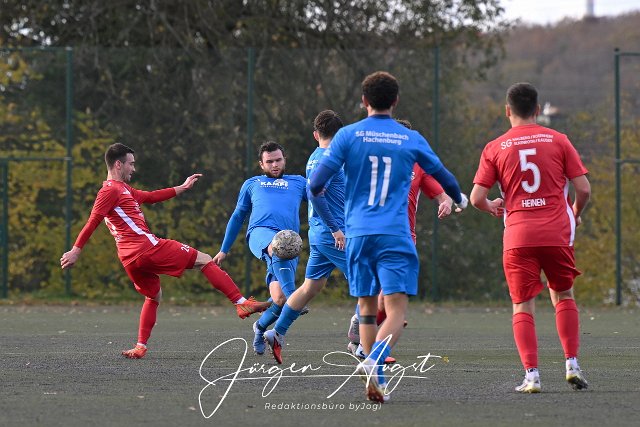 Fussball, Bezirksliga Ost, SG Malberg (rot) vs. SG Mueschenbach (blau), 02.11.2025 | ||